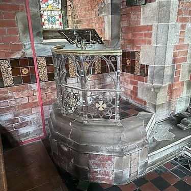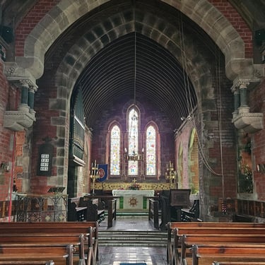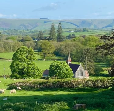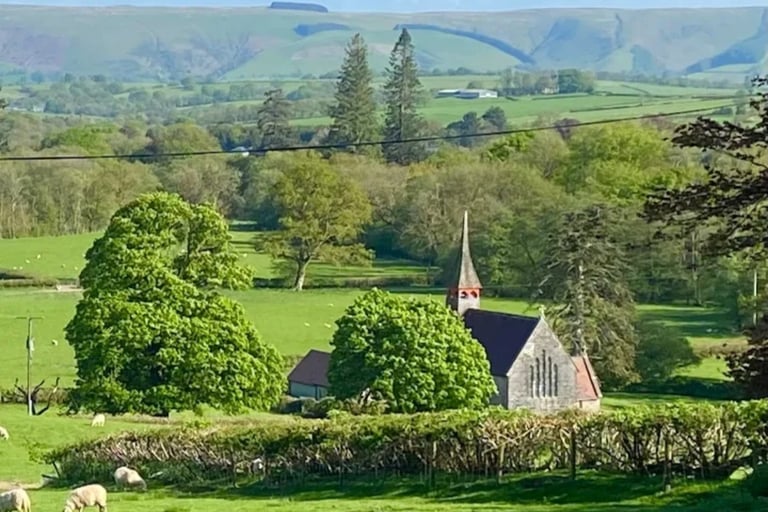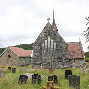 Eglwys Oen Duw can be translated as Church of the Lamb and it was built in 1865 by the patronage of Mrs Clara Thomas from the neighbouring residence of Llyn Madoc. The renowned architect was John Norton and it's built in the Gothic style with a single central spire which is very unusual for a rural church.