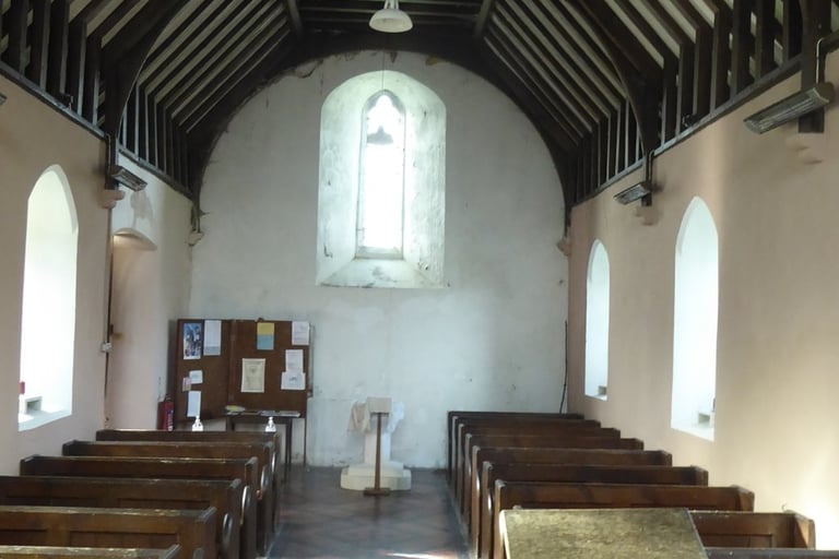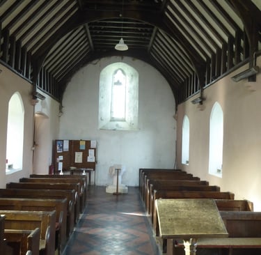 Llanfechan Church stands on a distinct mound of raised stone, and the roughly circular churchyard is a sign of its antiquity. The old church was, as is the present one, a simple, one chamber building.